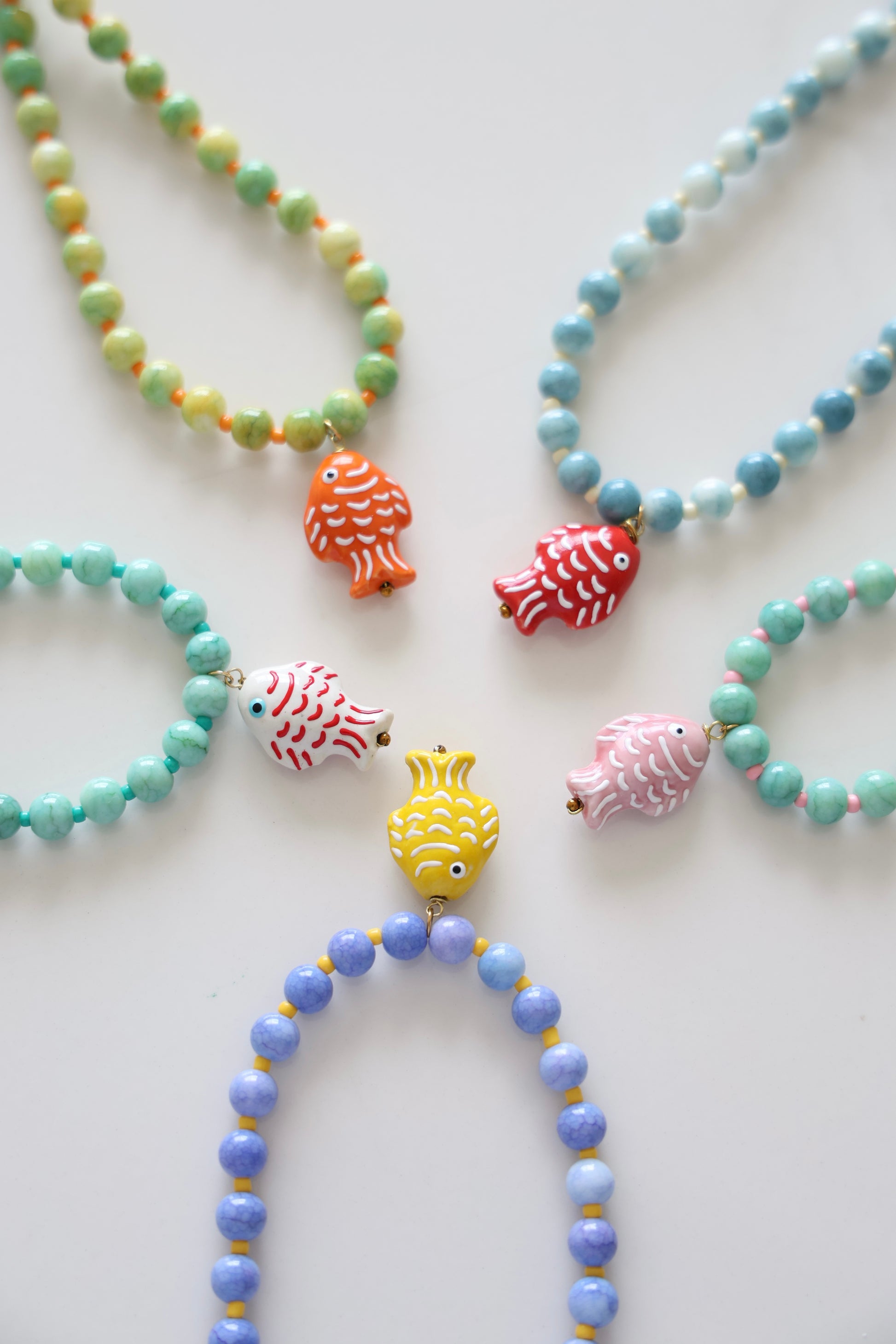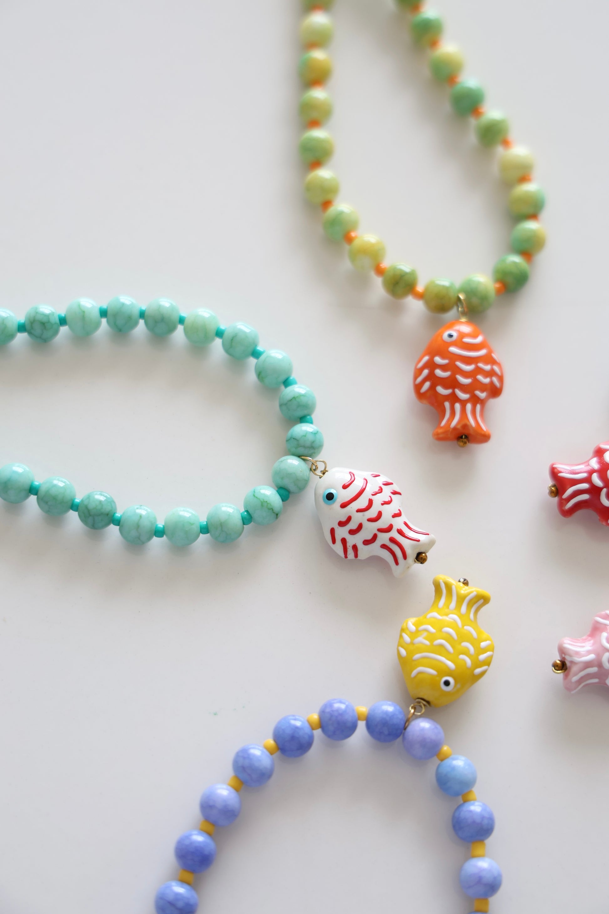 Colar produzido com pedras, missangas e peixes em cerâmica.